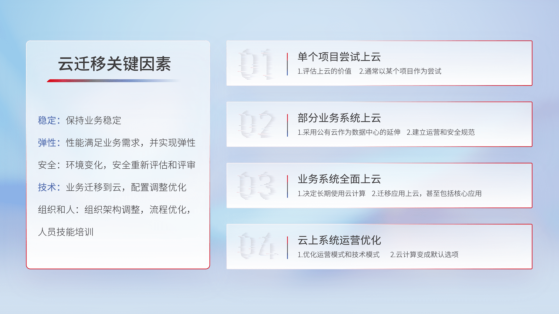 结合实际业务,,,从规划设计、、、云平台选型、、云原生改造、、数据迁移、、集成交付,,迁移全过程为客户识别最佳上云路径,,,,做好风险识别管理,,,设计网络架构、、身份权限、、、安全审计合规、、操作审计、、日志审计、、、、监控告警策略、、、、多站点容灾设计等,,对云上基础设施进行整体规划,,,提升IT治理水平,,,以满足弹性、、高可用、、、高性能的需求。。。